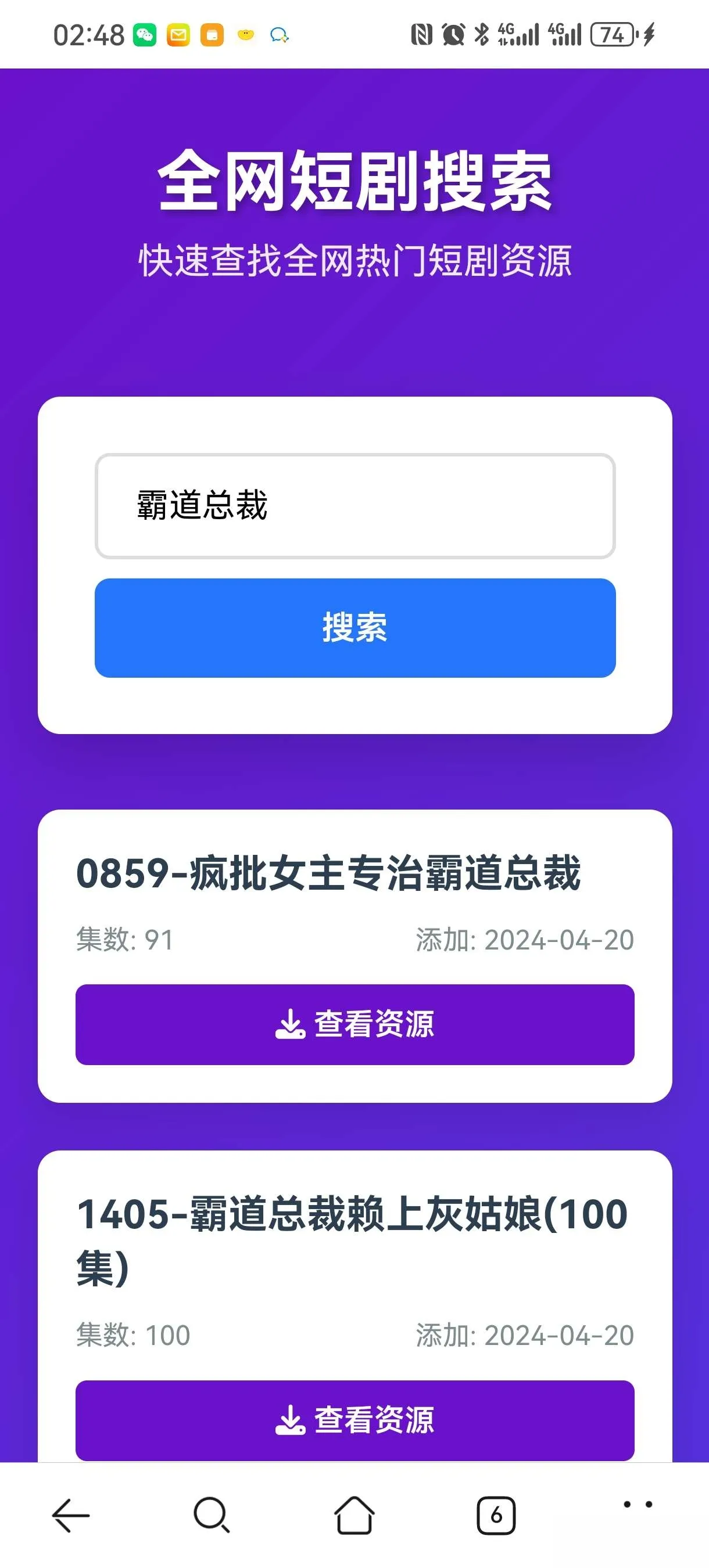 该软件提供短剧搜索功能,用户可通过关键词快速查找相关内容。搜索结果以卡片形式展示,包含短剧名称、集数、添加时间和查看链接。页面采用响应式设计,适配手机和电脑屏幕,搜索过程中显示加载动画,无结果时提供提示信息。